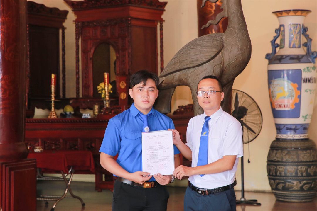 Đồng chí Nguyễn Văn Tân trao quyết định kết nạp đảng cho đoàn viên Huỳnh Xuân Khánh