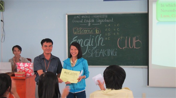 With the aim of creating a playground of profound and useful knowledge for students at Lac Hong University after stressful studying hours and helping students improve their confidence in communication, at 7.30 a.m. on November 18, the General English Department held the second English speaking club meeting in room G501, campus 5. The topic is “Vietnamese Teachers’ Day”. A lot of students from various departments participated in this club. In groups, they excitedly discussed the topic and confidently presented their ideas in public. At the end of the day, a scholarship was presented to Nguyen Thi Mien, a student from the Department of International Business Administration. The club meeting ended at 10.30 a.m.